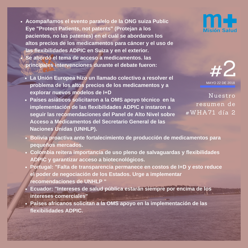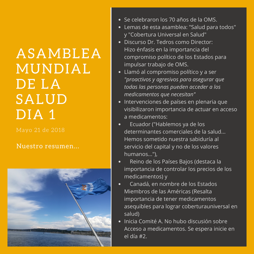 Es muy grato para nosotros compartir nuestra experiencia de este año en la Asamblea Mundial de la Salud No. 71, que, gracias a una invitación de Oxfam Internacional, Misión Salud, en su calidad de coordinadora de la Alianza LAC- Global por el Acceso a Medicamentos, está participando en la Asamblea Mundial de la Salud (AMS) que se está desarrollando entre el 21 y el 25 de mayo en Ginebra, Suiza, a través de su Subdirectora QF Andrea Carolina Reyes.