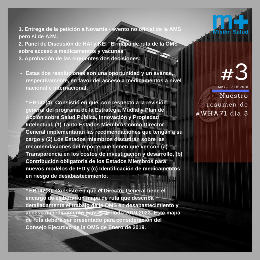 Recomendamos visitar el siguiente resumen realizado por el Instituto Suramericano de Gobierno en Salud (ISAGS) sobre cada una de las jornadas hasta hoy, en cual no solo abordan el tema de acceso a medicamentos sino también los temas más importantes para la salud pública global; así como también les recomendamos visitar los hashtags #AMS71 y #WHA71 de Twitter para seguir minuto a minuto lo que acontece durante la asamblea. Al finalizar esta publicación dejamos el enlace de las transmisiones en vivo vía streaming (horario Ginebra, Suiza) y en español.
