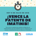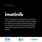 El pasado 9 de julio de 2018 venció la polémica patente del imatinib (Glivec®). Para Misión Salud, junto con IFARMA y el Centro de Información de Medicamentos de la Universidad Nacional de Colombia, es un motivo de celebración haber logrado la primera declaración de interés público de un medicamento en el país, primera en el mundo por solicitud de la sociedad civil y la academia.